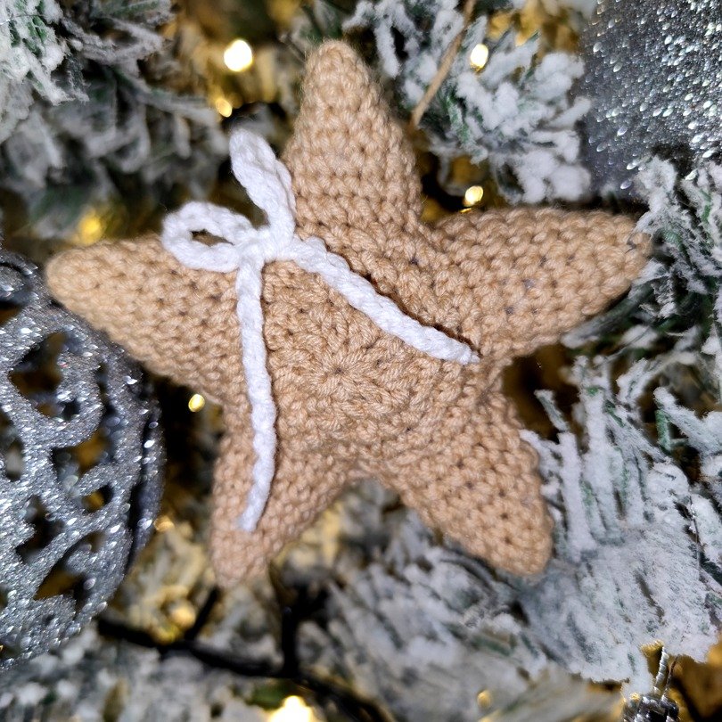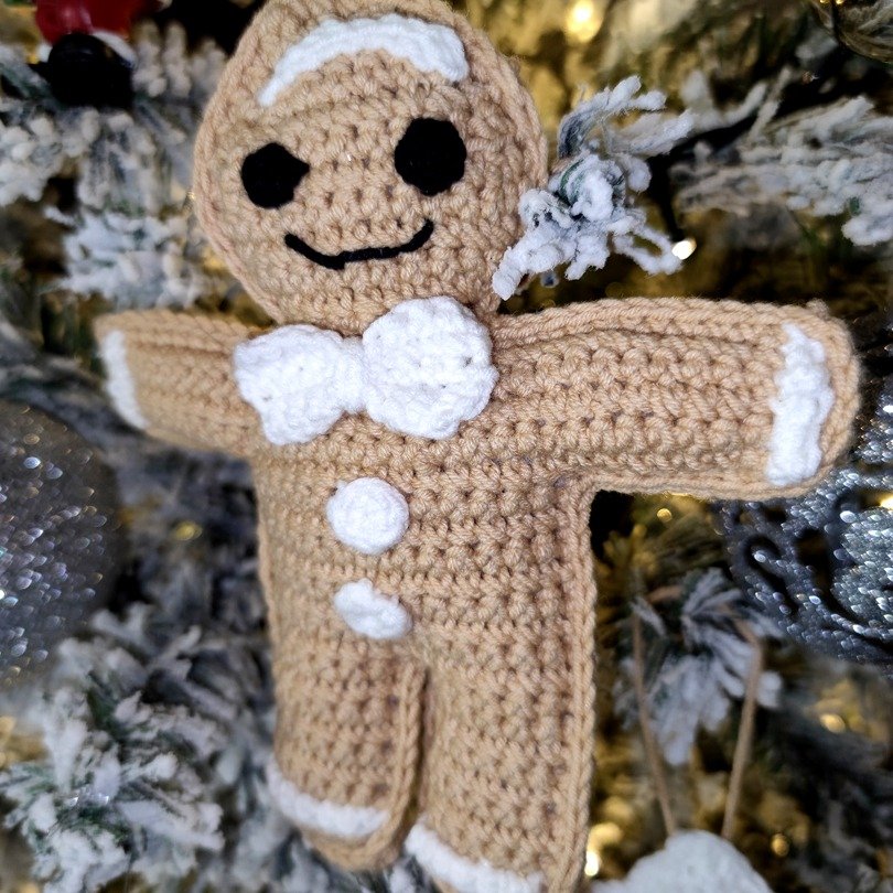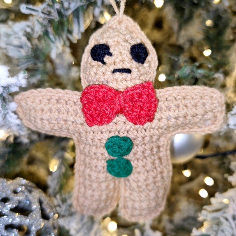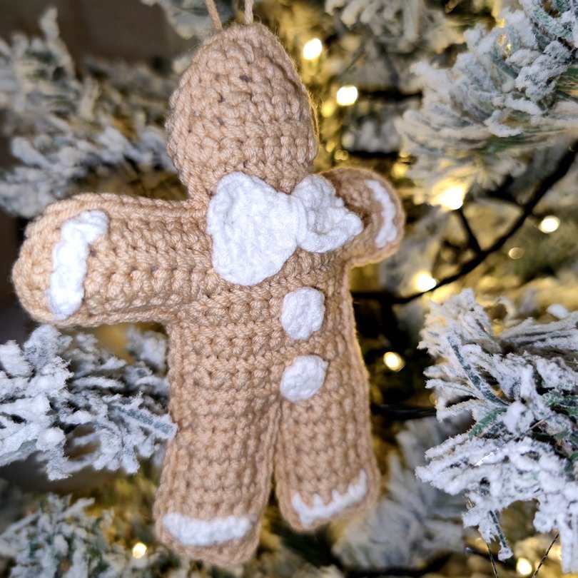 Χειροποίητα πλεκτά χριστουγεννιάτικα στολίδια σε σχέδιο μπισκότου, ιδανικά για δέντρο ή δώρο.