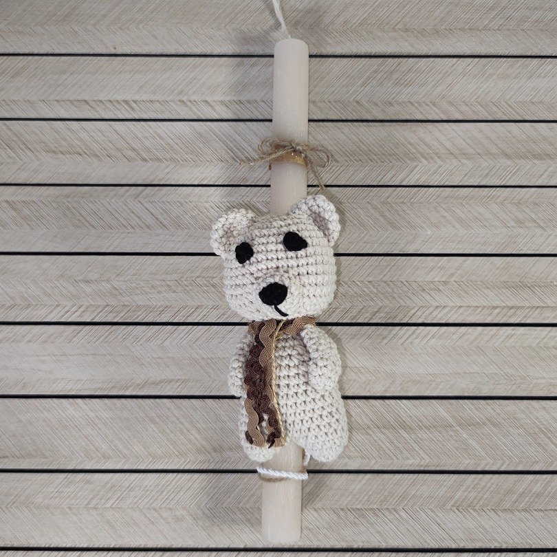 Χειροποίητη πασχαλινή λαμπάδα με πλεκτό αρκουδάκι σε μπεζ απόχρωση, ιδανική για ένα κομψό και minimal δώρο.