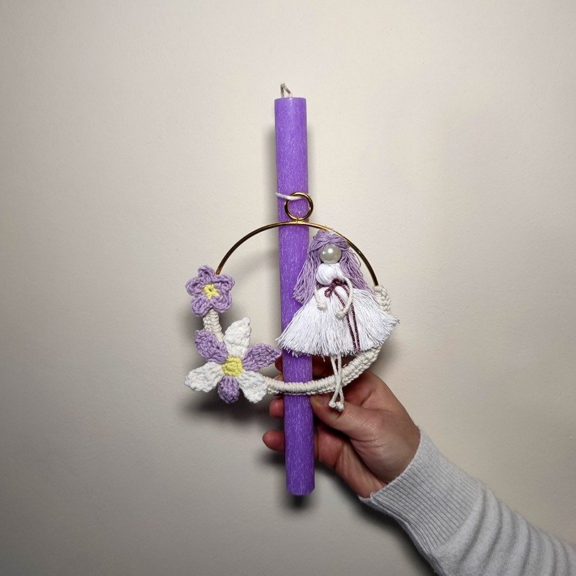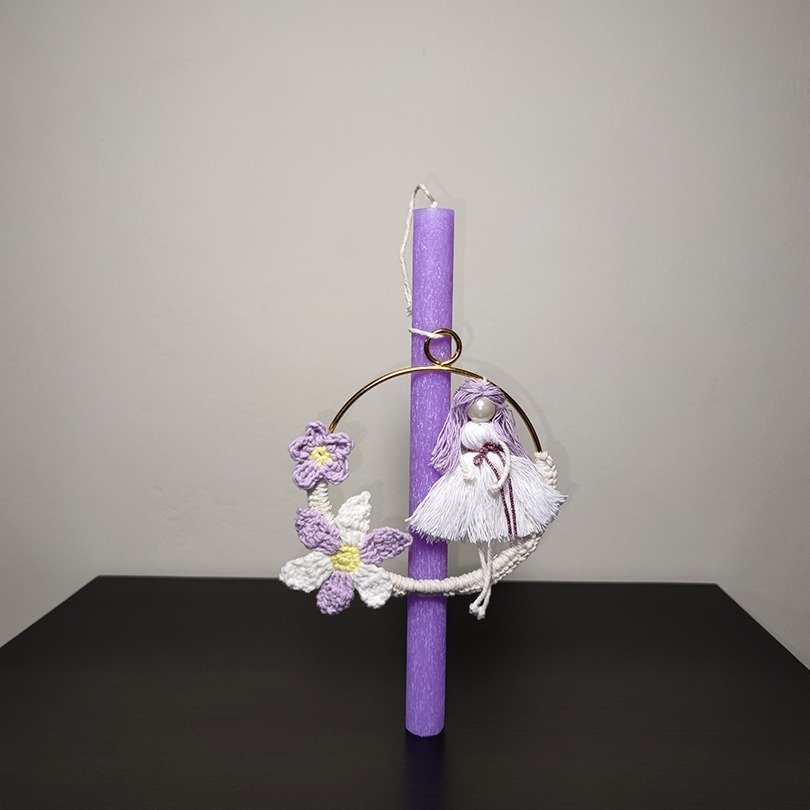 Χειροποίητη πασχαλινή λαμπάδα με διακοσμητικό κρίκο και πλεκτά λουλούδια, ιδανική για κομψό και ρομαντικό δώρο.