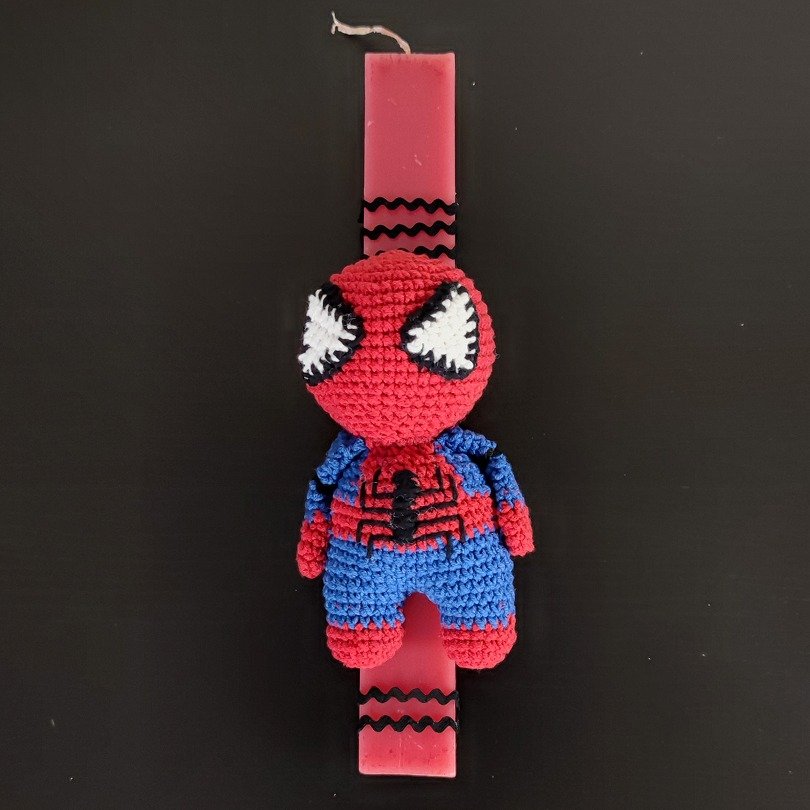 Χειροποίητη πασχαλινή λαμπάδα με πλεκτό Spiderman amigurumi, ιδανική για αγόρια που αγαπούν τους super heroes.