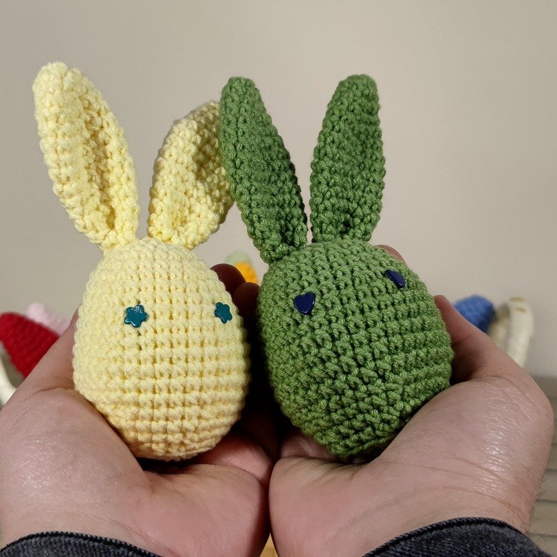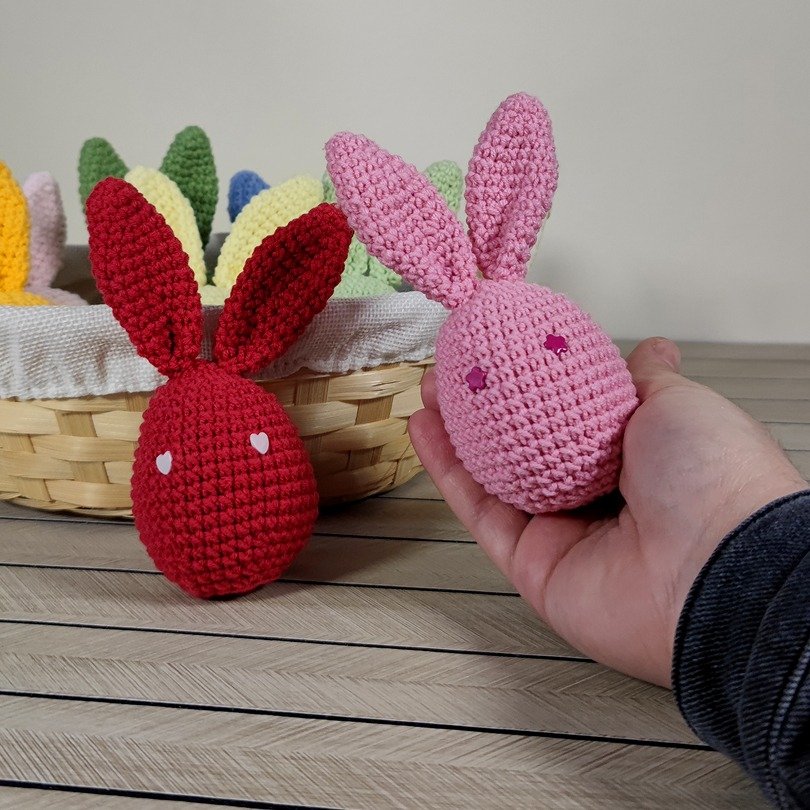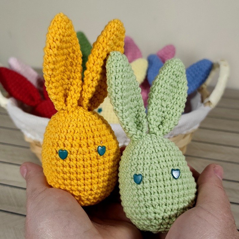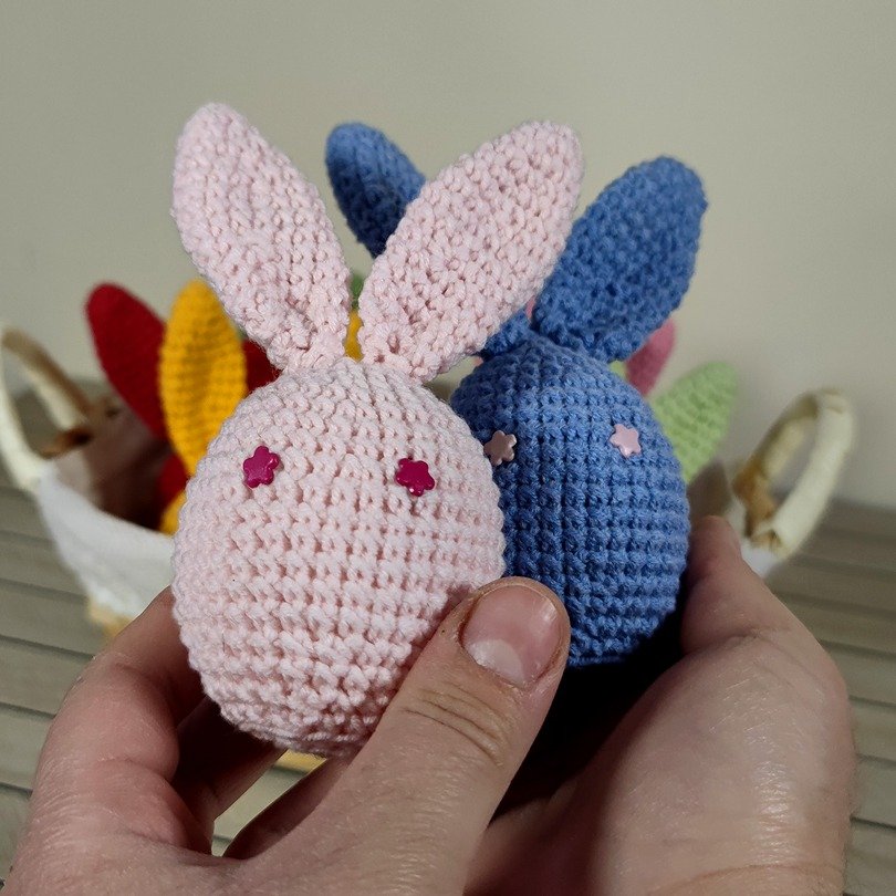 Πλεκτά λαγουδάκια amigurumi σε σχήμα αυγού, φτιαγμένα στο χέρι με βελονάκι και διαθέσιμα σε παστέλ και έντονες αποχρώσεις.