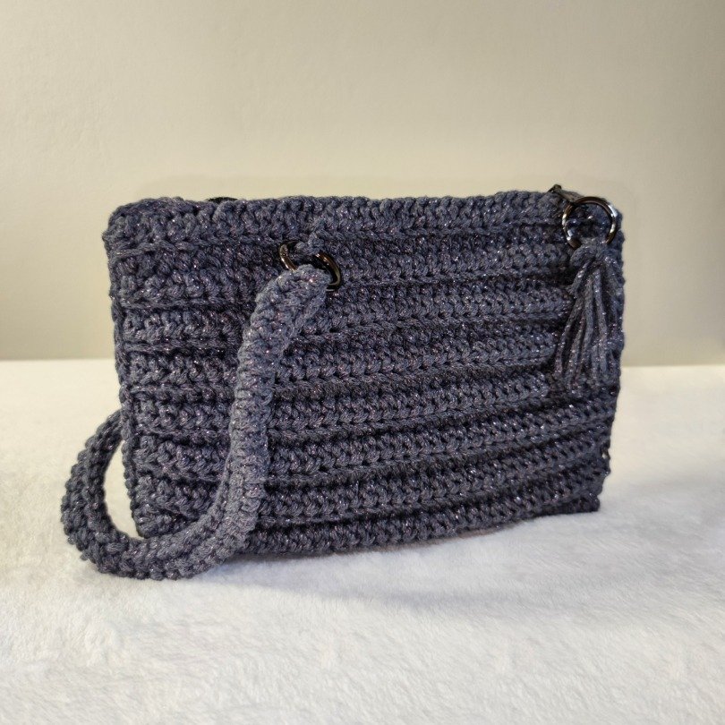 Χειροποίητο γκρι πλεκτό τσαντάκι με διακριτική λάμψη, ιδανικό για κομψές εμφανίσεις όλη την ημέρα.