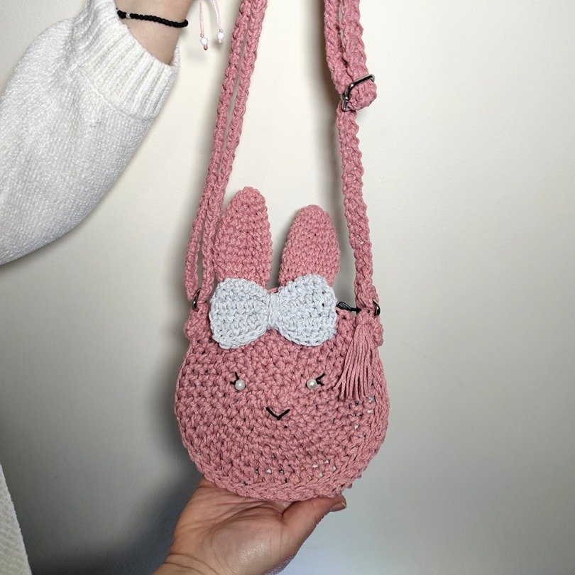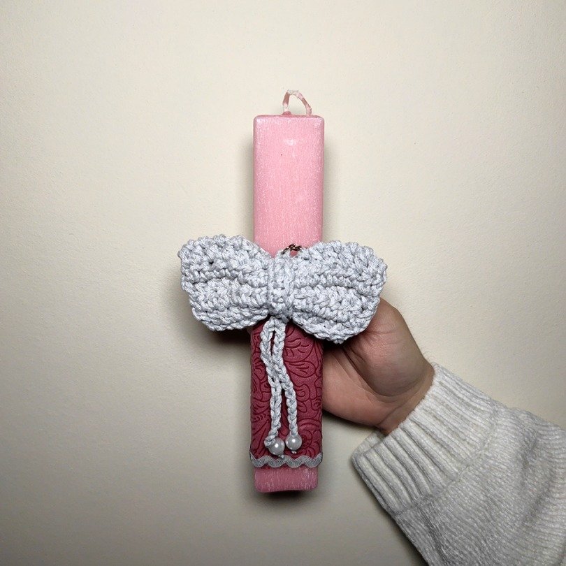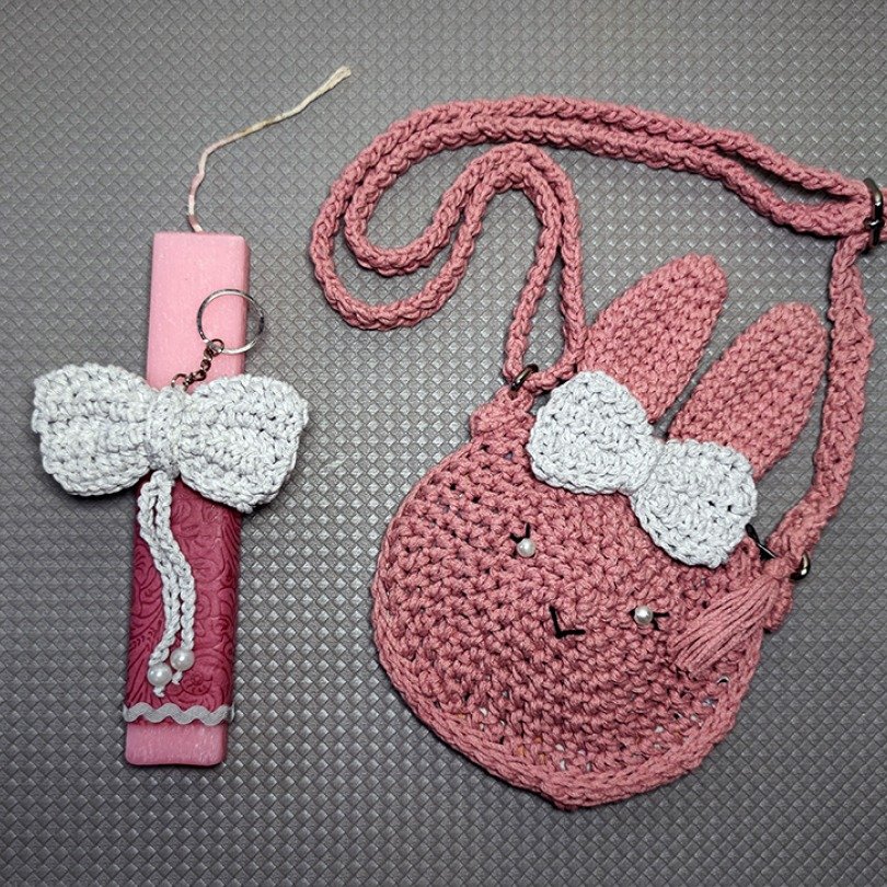 Χειροποίητο σετ που περιλαμβάνει πλεκτό τσαντάκι-κουνελάκι και ταιριαστή πασχαλινή λαμπάδα, φτιαγμένα με αγάπη για να κάνουν το Πάσχα ακόμα πιο ξεχωριστό.