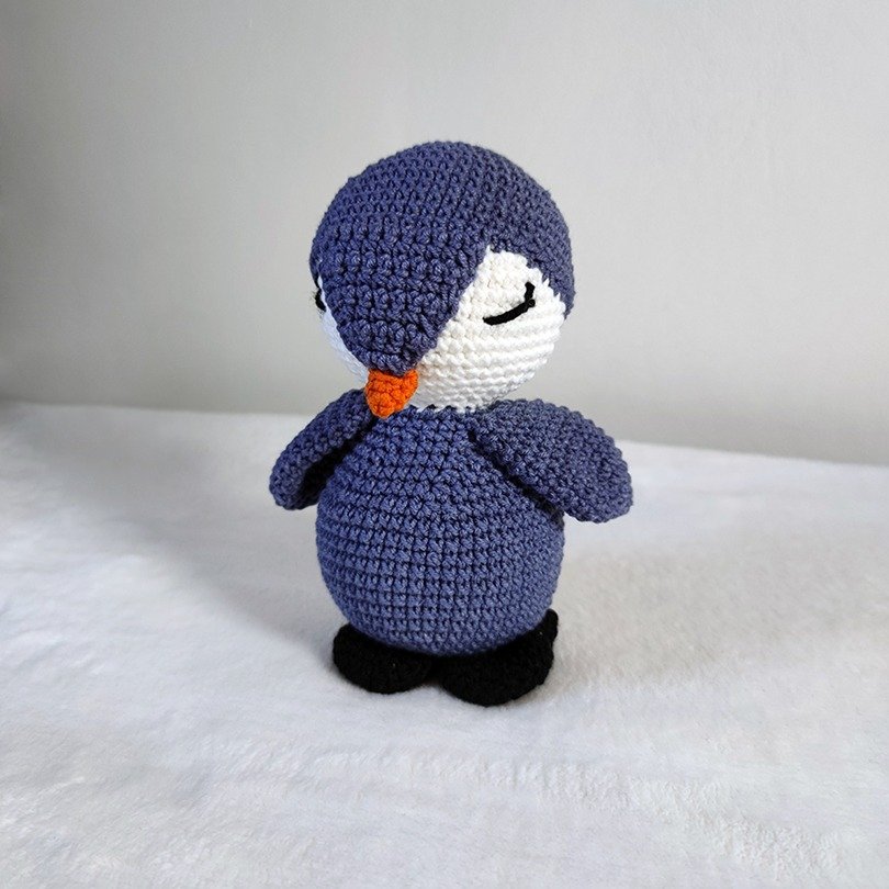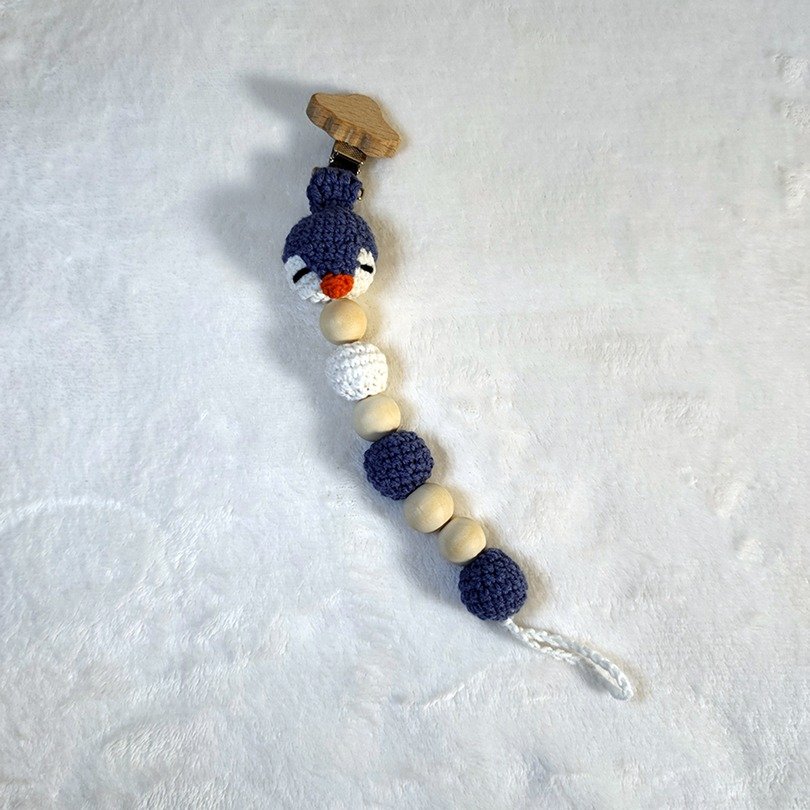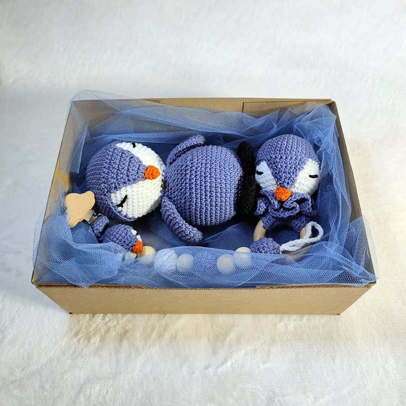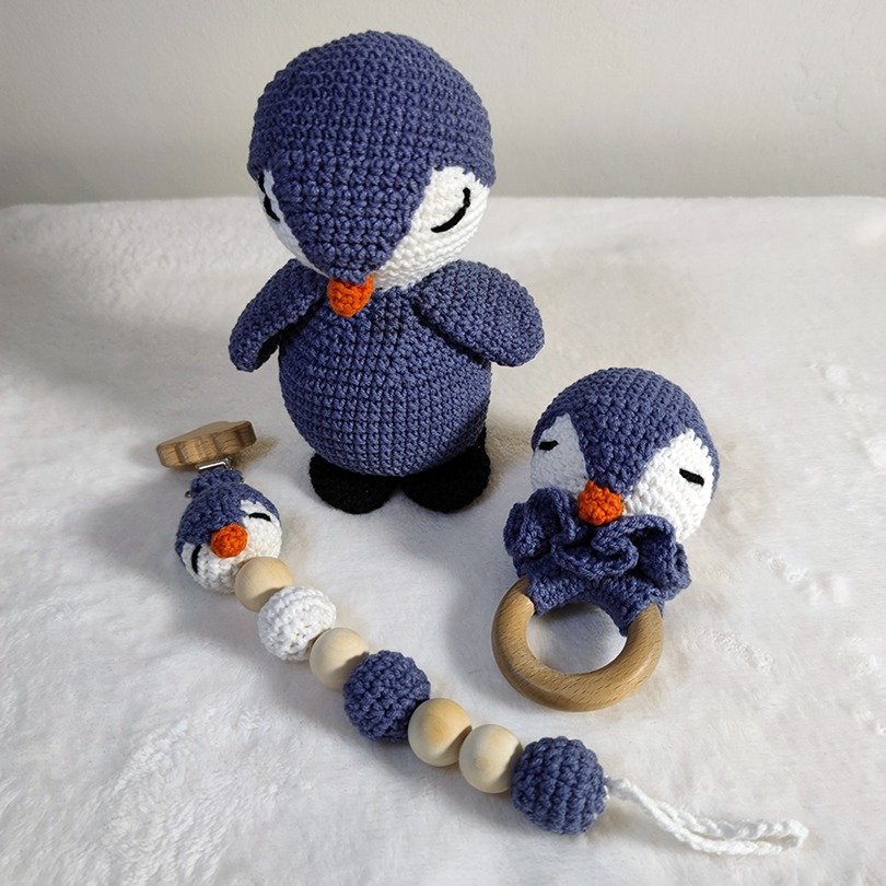 Το σετ περιλαμβάνει έναν πλεκτό πιγκουίνο amigurumi, έναν κρίκο παιχνιδιού και ένα κλιπ πιπίλας, σχεδιασμένα για να κρατούν συντροφιά στο μωρό και να προσφέρουν στιγμές χαλάρωσης και παιχνιδιού.
